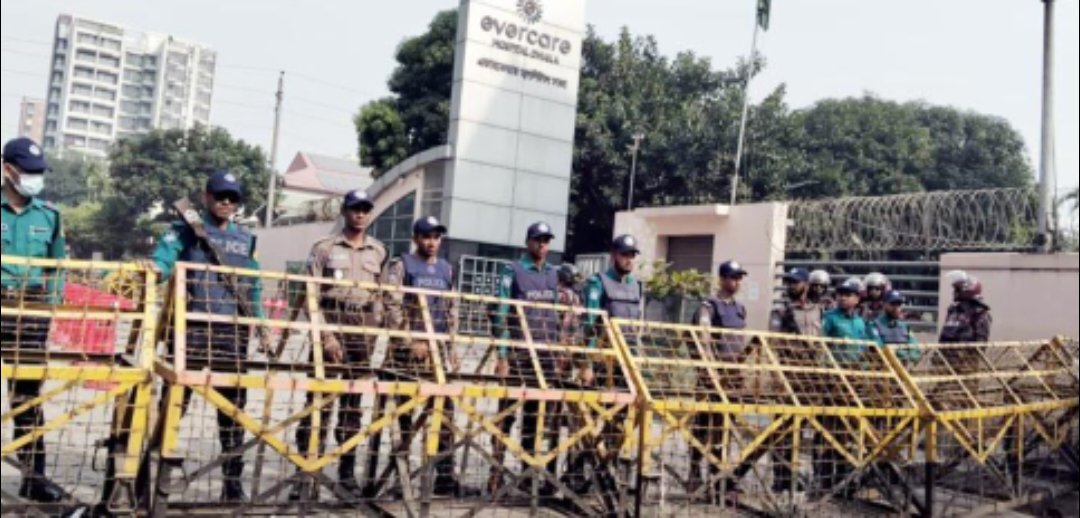 বুধবার (৩ ডিসেম্বর) সকালে রাজধানীর বসুন্ধরা এলাকায় অবস্থিত এভারকেয়ার হাসপাতাল ঘুরে দেখা গেছে, হাসপাতালটির প্রধান ফটকে ব্যারিকেড দিয়ে নিরাপত্তার দ্বায়িত্ব পালন করছেন আইনশৃঙ্খলা বাহিনীর সদস্যরা।
