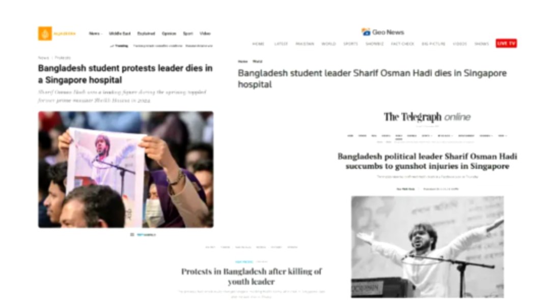 ইনকিলাব মঞ্চের মুখপাত্র শরিফ ওসমান হাদি চিকিৎসাধীন অবস্থায় সিঙ্গাপুর জেনারেল হাসপাতালে মারা গেছেন। তার মৃত্যুতে দেশজুড়ে নেমে এসেছে শোকের ছায়া। স্থানীয় সংবাদমাধ্যমের পাশাপাশি হাদির মৃত্যর খবর গুরুত্ব দিয়ে প্রকাশ করেছে আন্তর্জাতিক বিভিন্ন গণমাধ্যম।