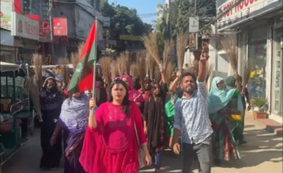 কিশোরগঞ্জে বিএনপি প্রার্থীর মনোনয়ন বাতিলের দাবিতে নারীদের ঝাড়ু মিছিল