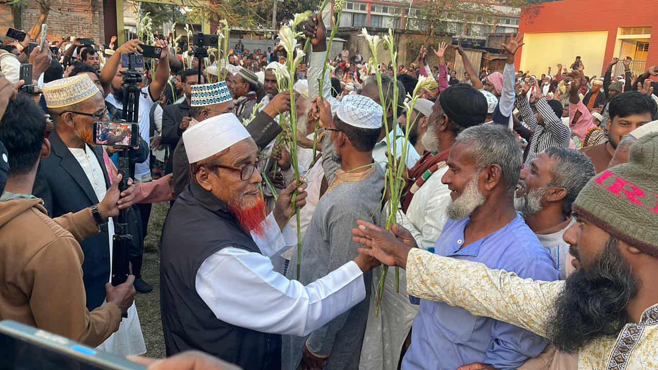 নতুন যোগদানকারীদের হাতে ফুল মাধ্যমে আনুষ্ঠানিকভাবে জামায়াতে ইসলামীতে স্বাগত জানান।