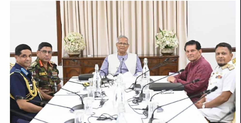 বৈঠকে আগামী ফেব্রুয়ারির প্রথমার্ধে অনুষ্ঠিতব্য ত্রয়োদশ জাতীয় সংসদ নির্বাচনকে সামনে রেখে দেশের সার্বিক নিরাপত্তা পরিস্থিতি নিয়ে আলোচনা হয়। প্রধান উপদেষ্টা তিন বাহিনীর প্রধানদের নির্দেশনা দেন—নির্বাচনের সময় নিশ্ছিদ্র নিরাপত্তা নিশ্চিত করতে এবং ভোট যেন অবাধ, সুষ্ঠু, নিরপেক্ষ ও শান্তিপূর্ণভাবে অনুষ্ঠিত হয়, সে জন্য সর্বোচ্চ প্রস্তুতি নিতে।