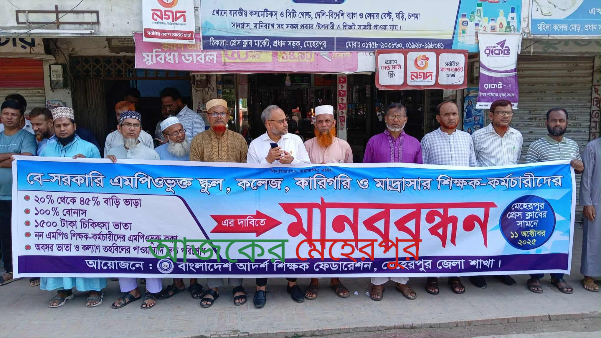 বেসরকারি এমপিওভুক্ত স্কুল, কারিগরি ও মাদরাসা শিক্ষক-কর্মচারীদের বাড়ি ভাড়া-ভাতা ও বোনাসসহ ছয় দফা দাবিতে মেহেরপুরে শিক্ষকদের মানববন্ধন করেন। আজ শনিবার (১১ অক্টোবর) বেলা ১১টার সময় মেহেরপুর প্রেসক্লাবের সামনে বাংলাদেশ আদর্শ শিক্ষক ফেডারেশন, মেহেরপুর জেলা শাখার আয়োজনে এ মানববন্ধন অনুষ্ঠিত হয়।