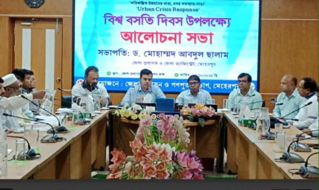 বিশ্ব বসতি দিবস উপলক্ষে মেহেরপুরে আলোচনা সভা ও র‍্যালি অনুষ্ঠিত হয়েছে। সোমবার সকালে জেলা প্রশাসন ও গণপূর্ত বিভাগের উদ্যোগে জেলা প্রশাসকের সম্মেলন কক্ষে এ আলোচনা সভা অনুষ্ঠিত হয়।