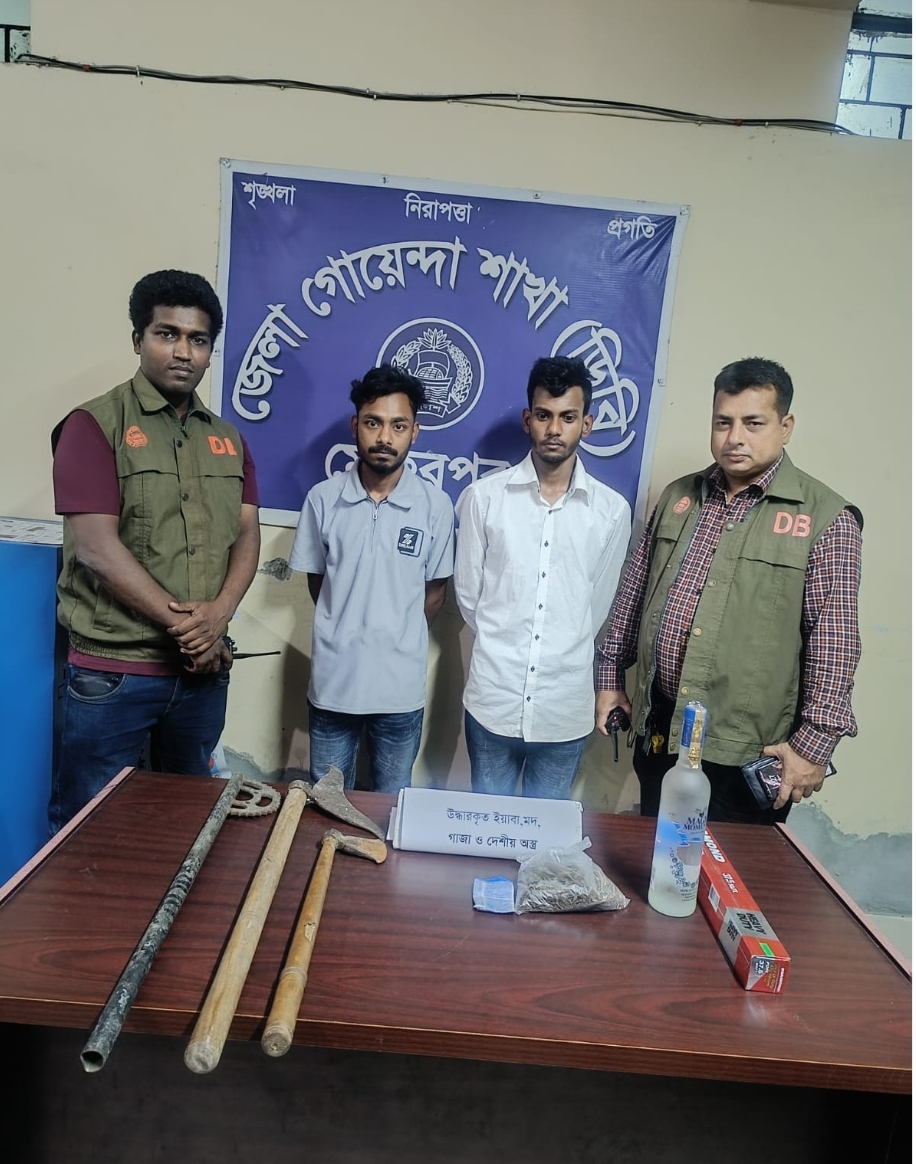 মেহেরপুর শহরের ফুলবাগান পাড়ায় অভিযান চালিয়ে দেশীয় অস্ত্র, ইয়াবা, গাঁজা ও বিদেশি মদসহ দুই যুবককে গ্রেপ্তার করেছে জেলা গোয়েন্দা শাখা (ডিবি) পুলিশ। এ ঘটনায় আরও একজনকে পলাতক আসামি হিসেবে উল্লেখ করা হয়েছে।