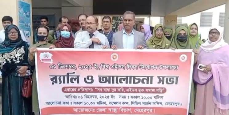 বিশ্ব এইডস দিবস-২০২৫ উপলক্ষে মেহেরপুরে র‍্যালি ও আলোচনা সভা অনুষ্ঠিত হয়েছে। সোমবার (১ ডিসেম্বর ২০২৫) সকাল ১০টার দিকে জেলা স্বাস্থ্য বিভাগের উদ্যোগে মেহেরপুর ২৫০ শয্যা বিশিষ্ট জেনারেল হাসপাতাল প্রাঙ্গণ থেকে একটি র‍্যালি বের হয়। র‍্যালিটি শহরের প্রধান সড়ক প্রদক্ষিণ করে পুনরায় হাসপাতাল চত্বরে এসে শেষ হয়।