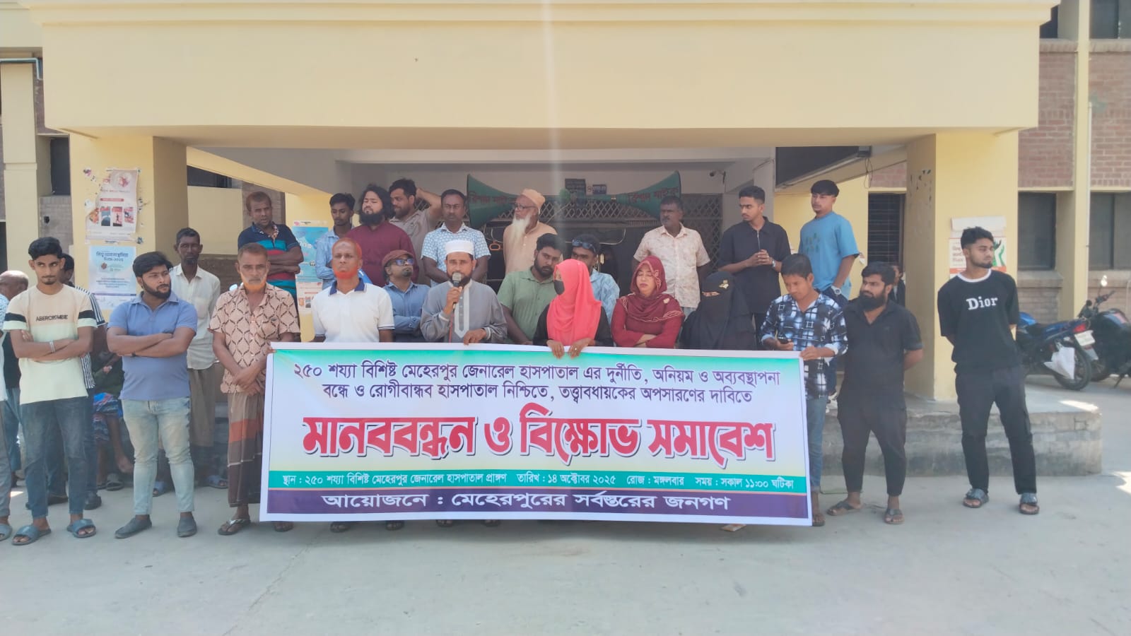 ২৫০ শয্যা বিশিষ্ট মেহেরপুর জেনারেল হাসপাতালে চলমান দুর্নীতি, অনিয়ম ও অব্যবস্থাপনার প্রতিবাদে এবং রোগীবান্ধব হাসপাতাল নিশ্চিতকরণ ও তত্ত্বাবধায়কের অপসারণের দাবিতে মানববন্ধন ও বিক্ষোভ সমাবেশ অনুষ্ঠিত হয়েছে।