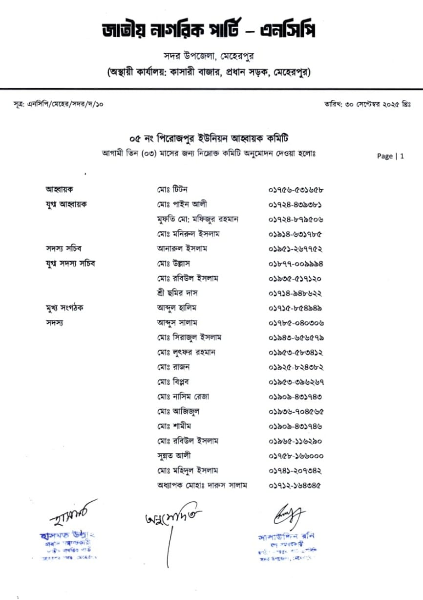 মেহেরপুর সদর উপজেলার ৫ নং পিরোজপুর ইউনিয়নে জাতীয় নাগরিক পার্টি-এনসিপি’র আহবায়ক কমিটি গঠন করা হয়েছে। আগামী তিন মাসের জন্য ২১ সদস্যবিশিষ্ট এ কমিটির অনুমোদন দেওয়া হয়।